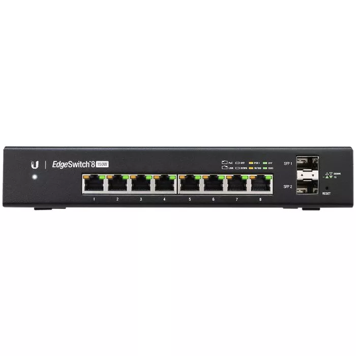 The Ubiquiti EdgeSwitch ES-8-150W is a robust and versatile managed Gigabit switch tailored for high-performance networks. It features 8 Gigabit RJ45 ports with 24V passive PoE, delivering a total PoE power of 150W, and 2 additional SFP ports for high-speed fiber connectivity. The device supports advanced Layer-2 switching capabilities and Layer-3 routing for seamless integration into growing infrastructures.