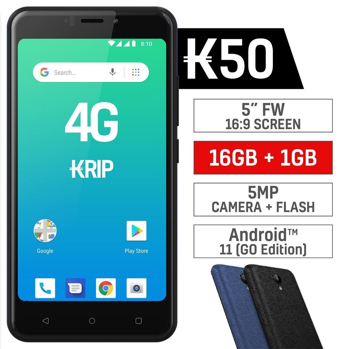 KRIP K50 4G LTE – NEW 🚨 💥5″ FW 16:9 Screen 💥16GB ROM + 1GB RAM 💥Android 11 (GO Edition) 💥5MP + Flash